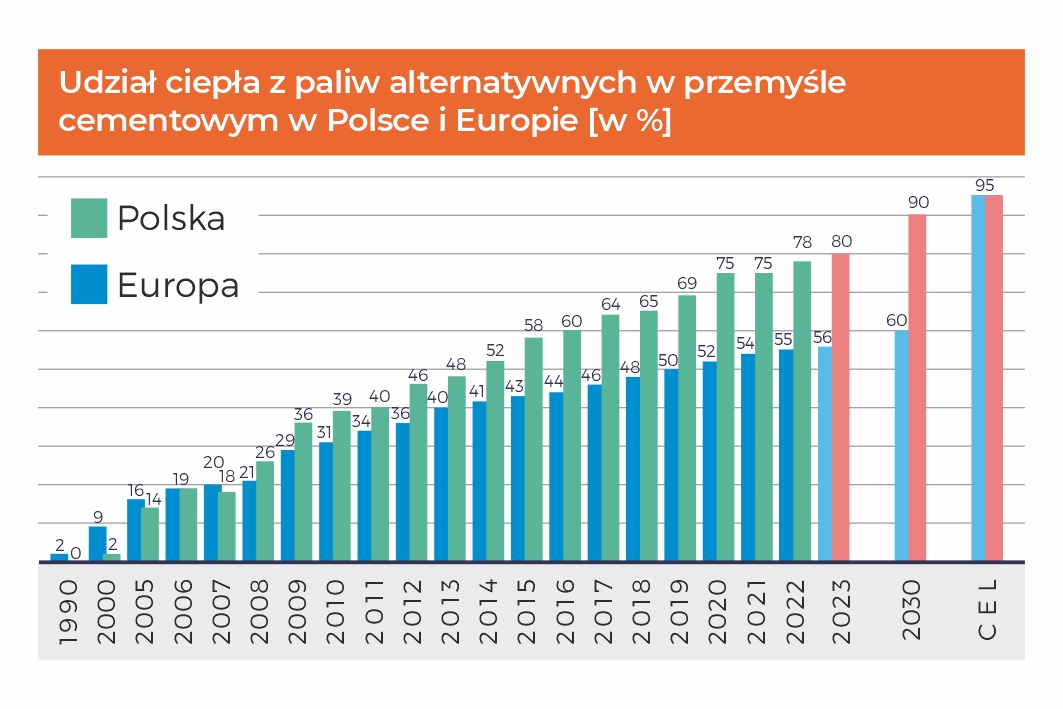 Pomimo, iż 80-procentowe zastąpienie węgla przez paliwa alternatywne w polskich cementowniach jest zdecydowanie najlepszym wynikiem w Europie, to celem jest osiągnięcie poziomu 90% w 2030 r. Docelowo możliwe jest aż 95% zastąpienie węgla, co oznacza praktycznie zaprzestanie jego wykorzystania i dalszą redukcję emisji CO₂. W stosunku do 1990 r., krajowy przemysł cementowy ograniczył emisję dwutlenku węgla o ponad 30%, co było możliwe między innymi dzięki rozwinięciu technologii użycia paliw alternatywnych.
